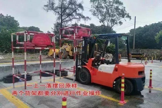 作業(yè):乙?guī)斓呢浖埽ǜ叩哪莻€(gè))入叉叉貨以后倒車直接升到頂(油缸提升的時(shí)候要加油提速,不要怠速提升),放下后稍微停一下,馬上又提升放回下層,然后倒車入丁庫(kù),入庫(kù)時(shí)只要求整車身入庫(kù),入庫(kù)后,貨叉要放到地,不然要扣分。丙庫(kù)的貨架一樣的操作,貨架放地上以后,倒車回甲庫(kù)起點(diǎn),貨叉也要入庫(kù),謹(jǐn)記貨叉要后傾并提升至離地20-40cm。