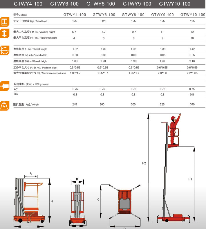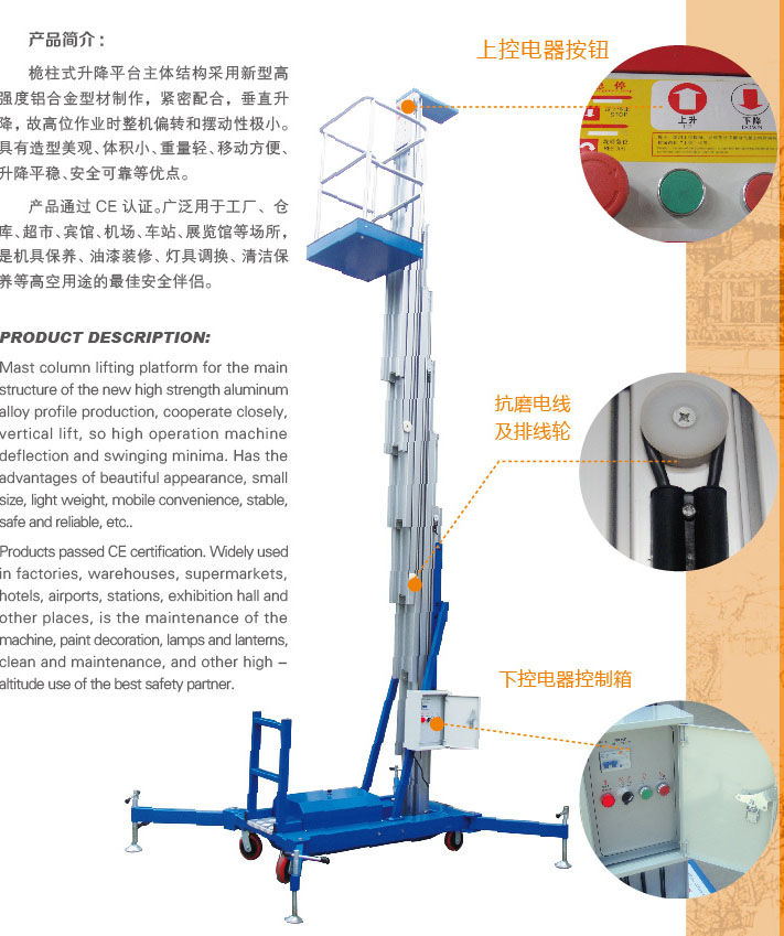 桅柱式升降平臺主體結(jié)構(gòu)采用新型高強(qiáng)度鋁合金型材制作,緊密配合,垂直升降,故高位作業(yè)時(shí)整機(jī)偏轉(zhuǎn)和擺性極小。具有造型美觀、體積小、重量輕、移動(dòng)方便、升降平穩(wěn)、安全可靠等優(yōu)點(diǎn)。